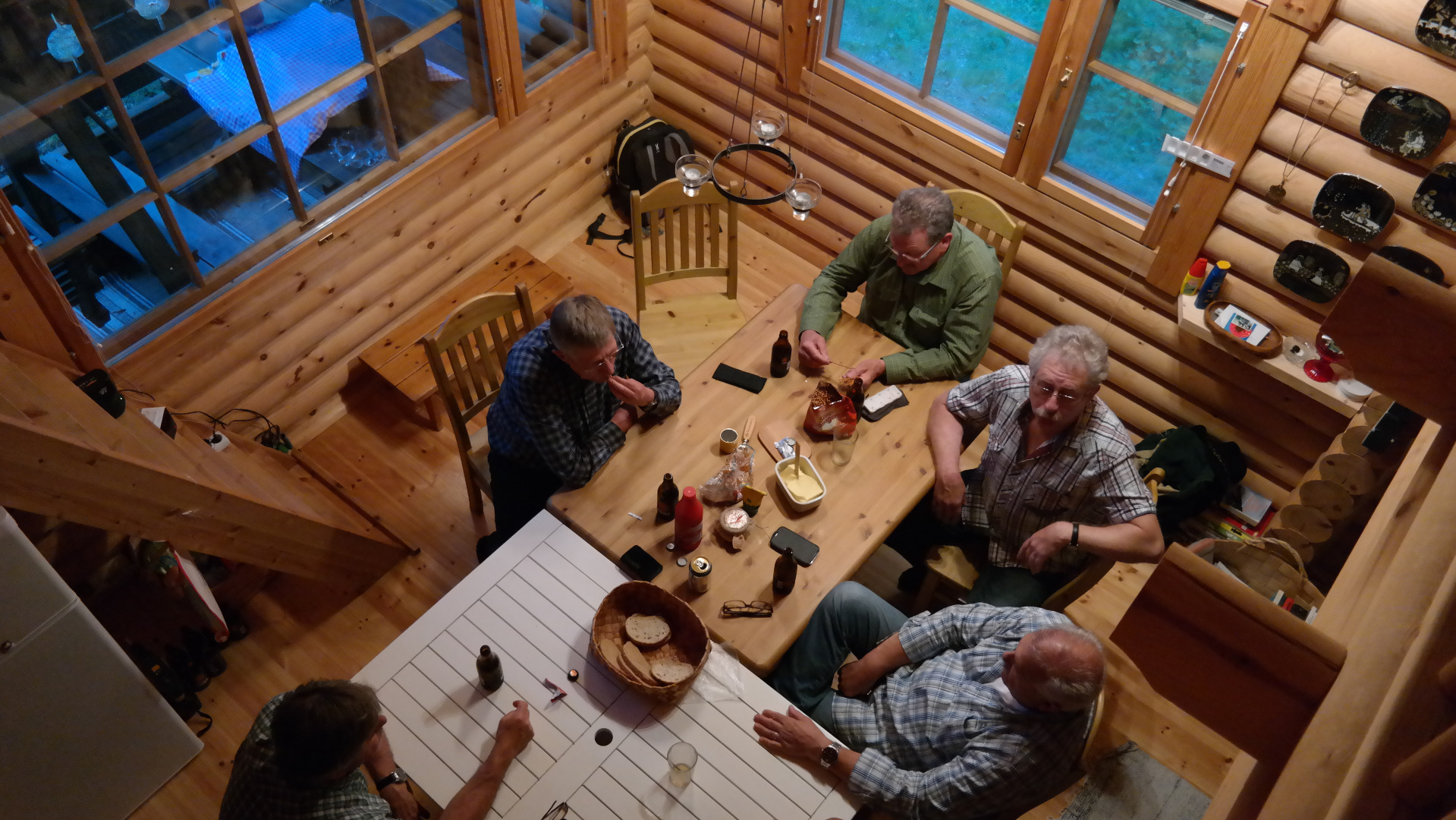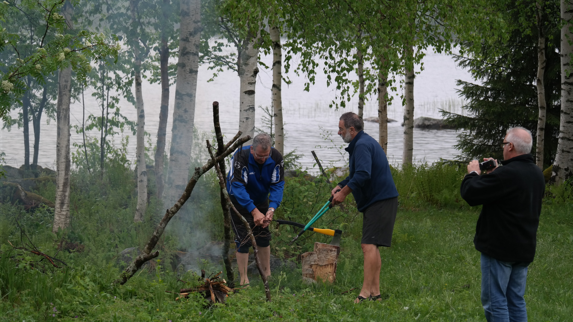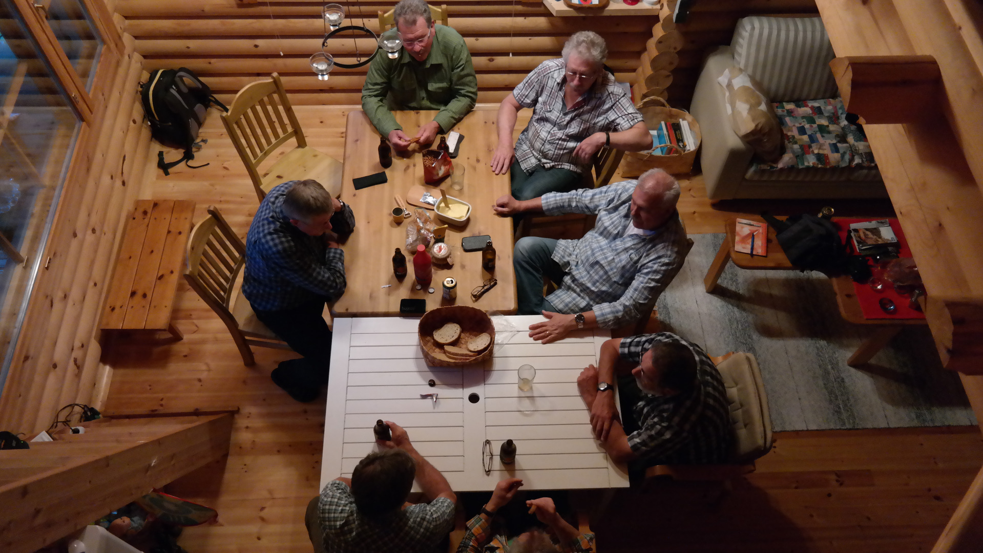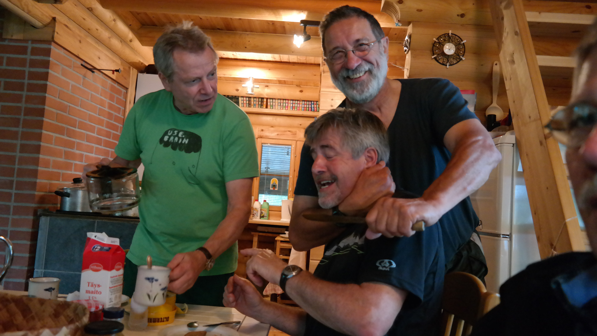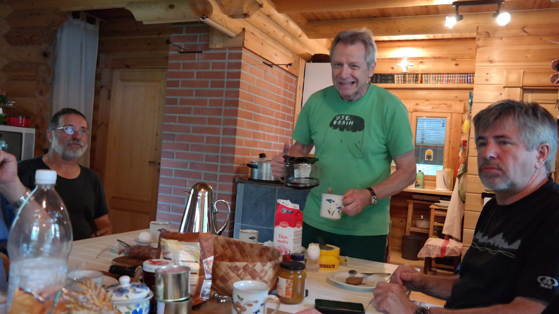 Wahnsinn, diese Reise, die uns Norbert (Fred) organisiert hatte. Von Frankfurt ging es jeweils mit dem Flugzeug zunächst bis nach Helsinki und anschließend weiter nach Joensuu. Dort wurden wir von unserem Gastgeber (Hans der Große) mit zwei Autos auf seine Halbinsel (Ahvenlahti) mit zwei großen Hütten gebracht. Für unseren Aufenthalt hatten wir ein Auto zur Verfügung, da der nächste Lebensmittelladen mehr als 20 km weit weg war. Darüber hinaus hatten wir zwei Ruderboote, mit welchen wir eine weitere Halbinsel unseres Gastgebers in etwa 20 Minuten zu einem Grillabend erreichten.